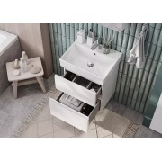 Тумба выполнена из влагостойкого МДФ и покрыта глянцевой эмалью, что делает ее устойчивой к воздействию влаги и легкой в уходе. Гладкая поверхность не только привлекательна, но и практична. Особое внимание стоит уделить высококачественной фурнитуре — доводчики с механизмом плавного и бесшумного закрывания от австрийского производителя Hettich обеспечивают долговечность и комфорт в использовании.