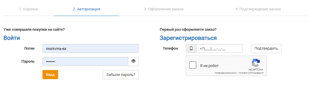 На странице оформления заказа Вам будет предложено авторизоваться или оформить заказ без регистрации, нажав на кнопку «Купить в один клик». Если вы зарегистрируетесь при заказе, в следующий раз в новый заказ будут автоматически добавлены ваши данные (ФИО, дисконтная карта). При этом Вы всегда будете в курсе событий, проводимых нашей компанией, выгодных предложений.