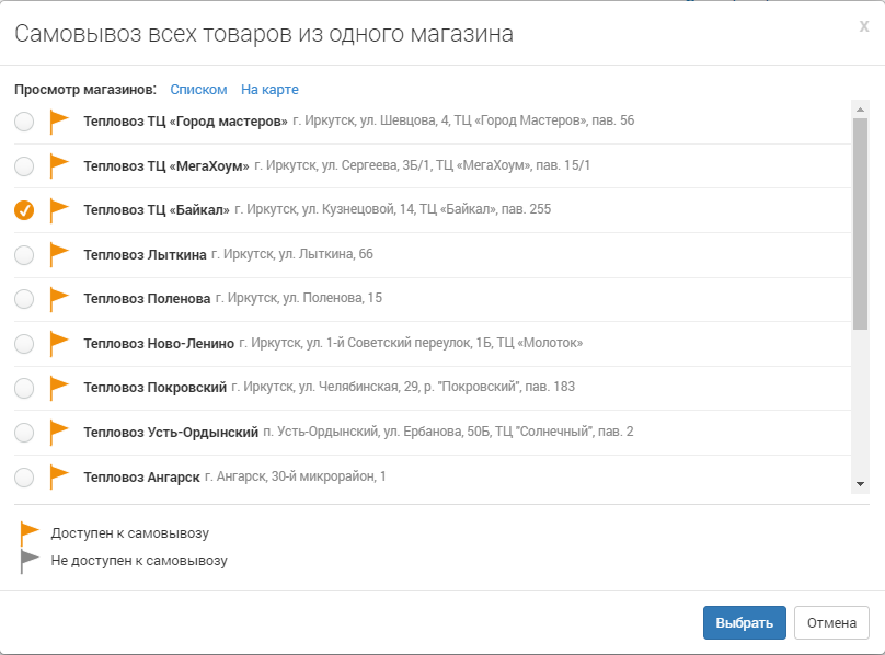 Если Вы планируете забрать заказ самостоятельно, то можете указать один из пунктов выдачи товара. Магазин, где все позиции из Вашего заказа есть в наличии, подсвечивается оранжевым цветом. Если товар отсутствует, то пункт самовывоза становится неактивным и выделяется серым цветом.